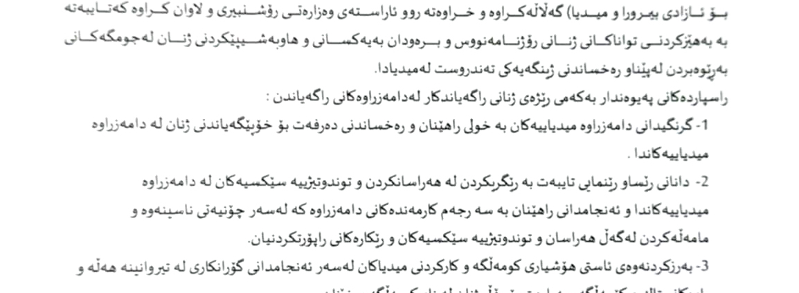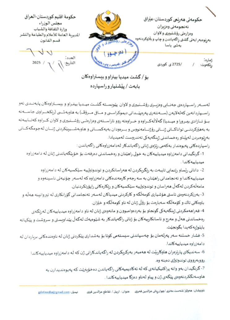 وەزارەتی ڕۆشنبیری حوکمەتی ھەرێمی کوردستان لەسەر ڕاسپاردەی ڕێکخراوی DHRD و ڕێکخراوی جاسەنە نووسراوی ئاراستەی سەرجەم دەزگا میدیا بینراو و بیستراوەکان کرد