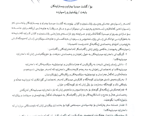 وەزارەتی ڕۆشنبیری حوکمەتی ھەرێمی کوردستان لەسەر ڕاسپاردەی ڕێکخراوی DHRD و ڕێکخراوی جاسەنە نووسراوی ئاراستەی سەرجەم دەزگا میدیا بینراو و بیستراوەکان کرد